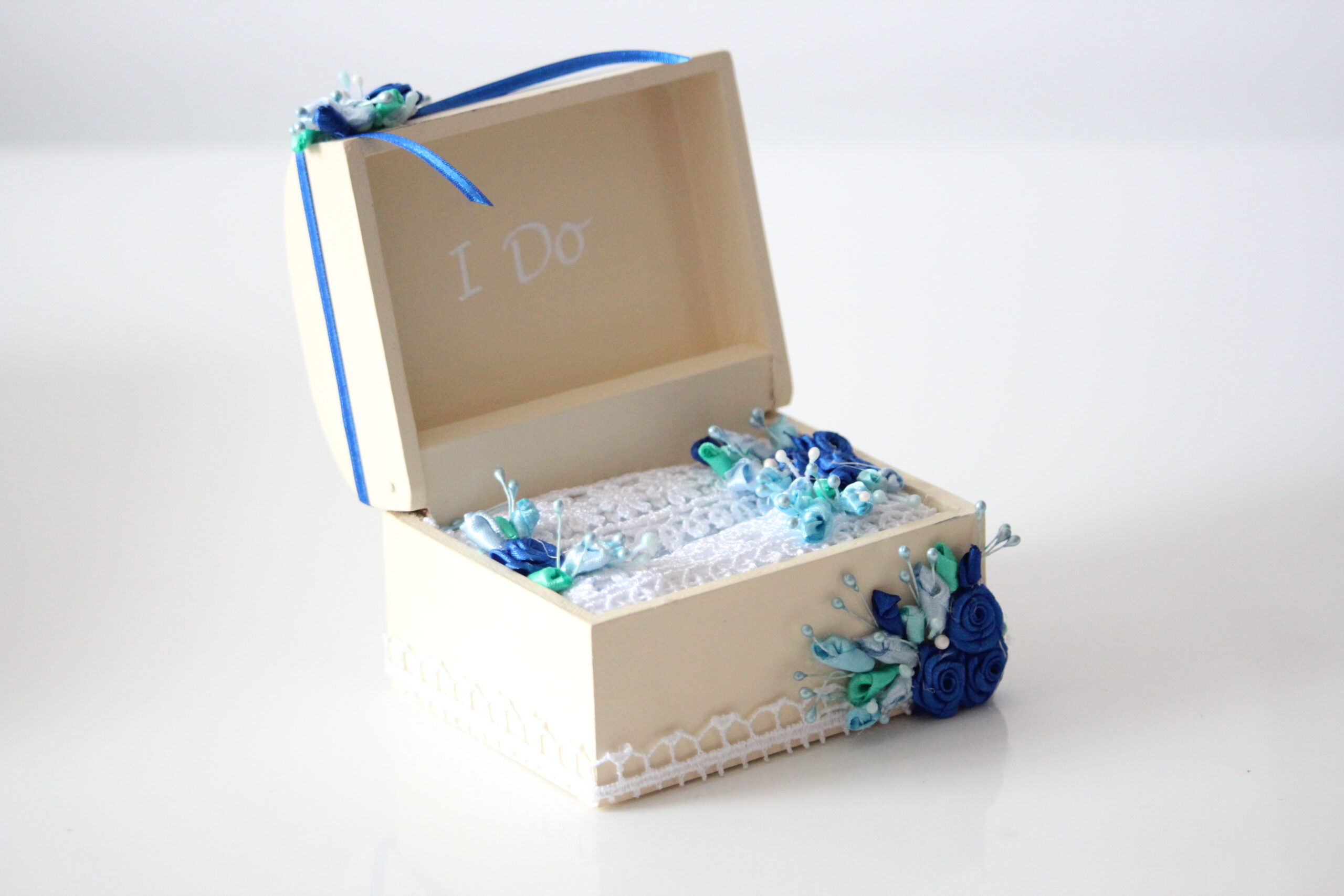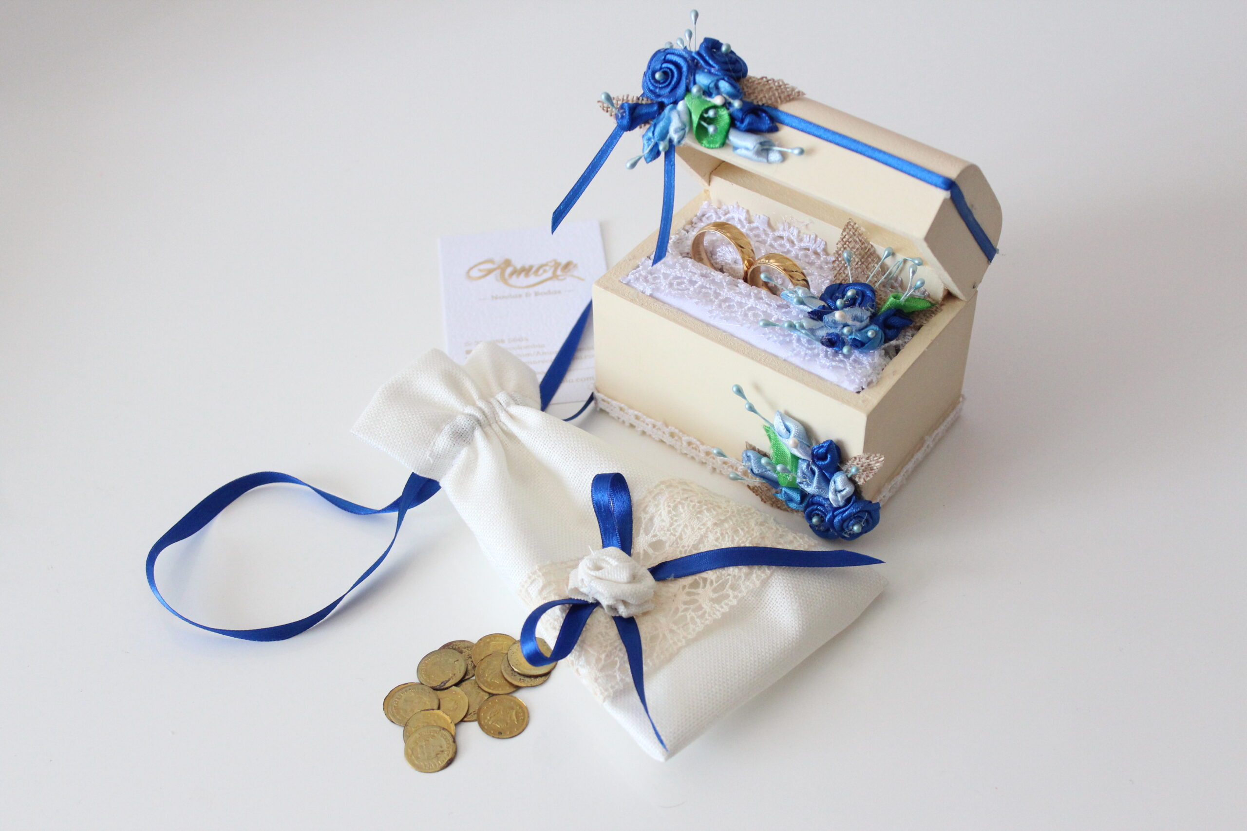 Elige este cofre original para llevar tus argollas el día de tu boda y guardar un recuerdo hermoso para toda la vida. Foto de muestra en beige con decoración azul. Puedes incluir grabado personalizado en la parte superior de la tapa.