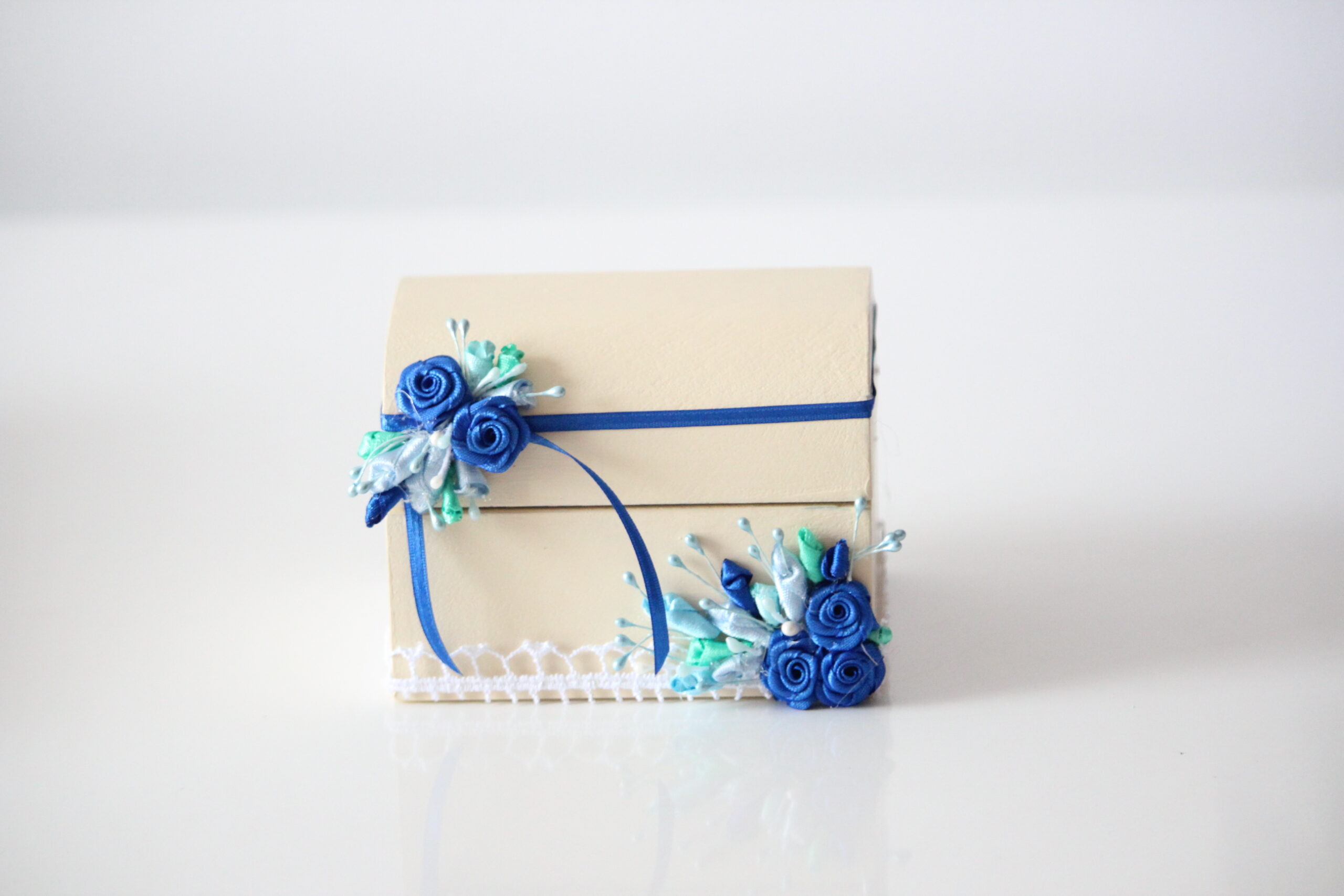 Baúl Beige decorado con encaje, flores de cintas azules y verdes.