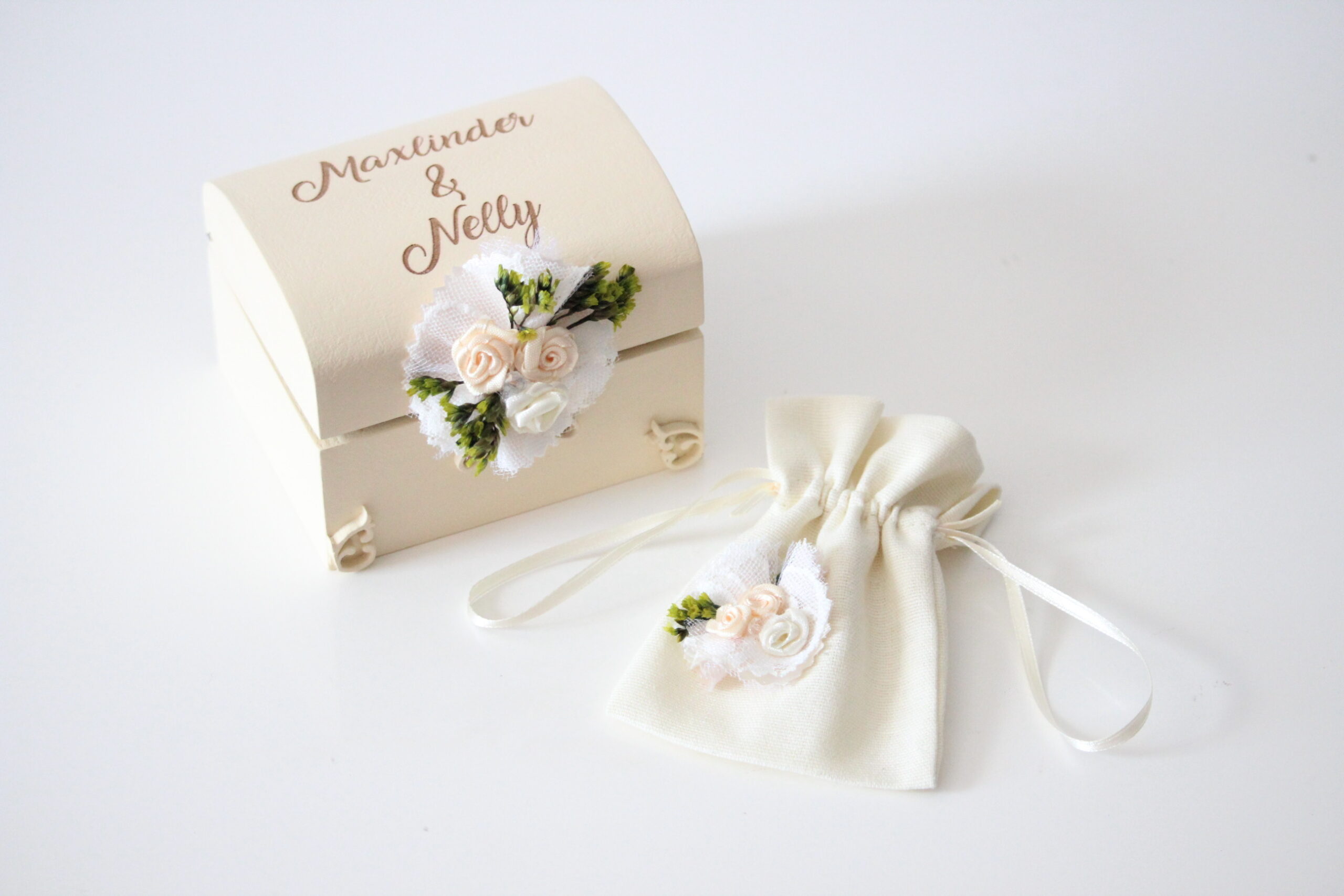 ¡El cofre más hermoso para tu día soñado! Esta preciosa caja personalizada, llamará la atención de los invitados a tu boda y te facilitará llevar los anillos de matrimonio de forma segura.